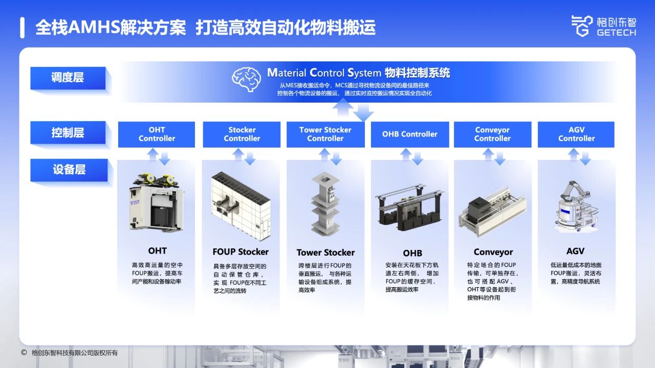 区别于单一设备供应商,恒行6提供“AI+CIM+AMHS”整体解决方案,一站式提供物料自动化上下游系统,包括MES、RTS、MCS、RTD、OHT、Stocker等,避免多厂商设备接口不兼容、数据不通畅问题;同时通过软硬融合、整厂管控,实现“存储-搬运-生产”全链路数据打通,助力工厂实现无人化、高效化运营。