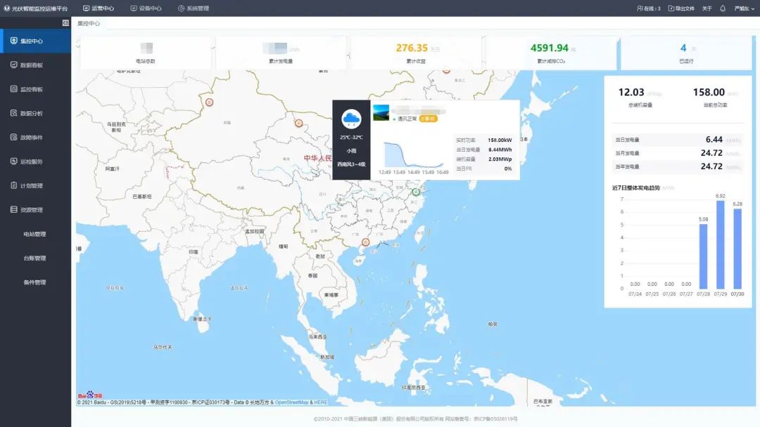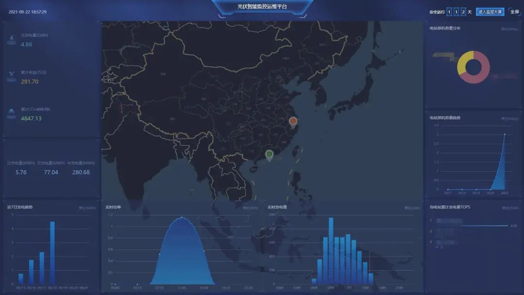 分布式光伏电站具有数量多、容量小、复杂程度高等特点,在传统电站运维方式下,对各种类型的电站没有统一的电站管理平台,管理粗放,无法做到整体可视,故障位置也无法精确定位,导致后期运维困难;采用人工运维方式,效率低下,影响电站整体收益。