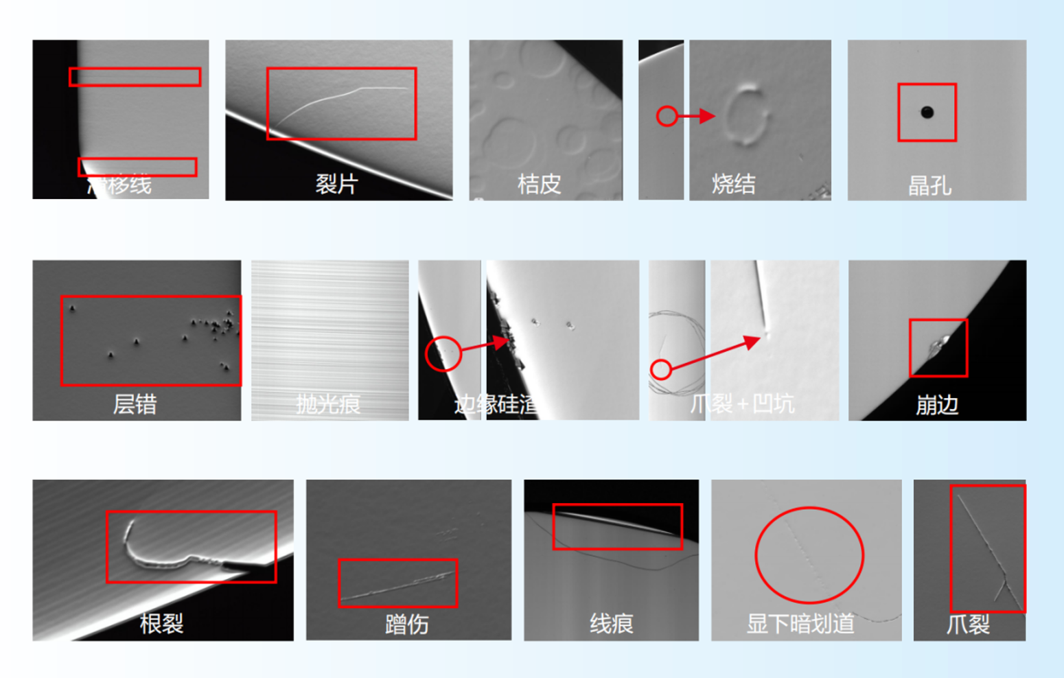 • 检测精度与一致性提升:缺陷检测整体准确率达 99%,其中硬伤类缺陷(如崩边、裂片)检出率99.9%,程度损伤类缺陷(如抛光痕、滑移线)检出率95% 以上,统一检测标准,消除人工主观误差。