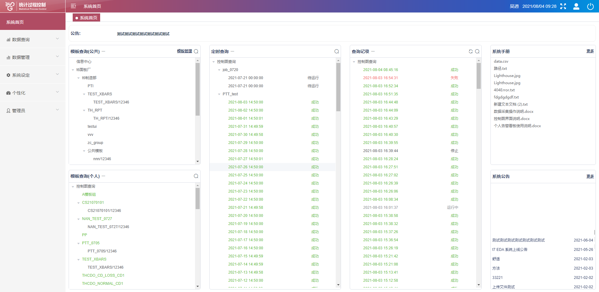 系统首页提供模板查询(公共/个人)、定时查询状态、查询记录、系统手册、系统公告等多元化用户互动功能;方便用户提供个性化设置;